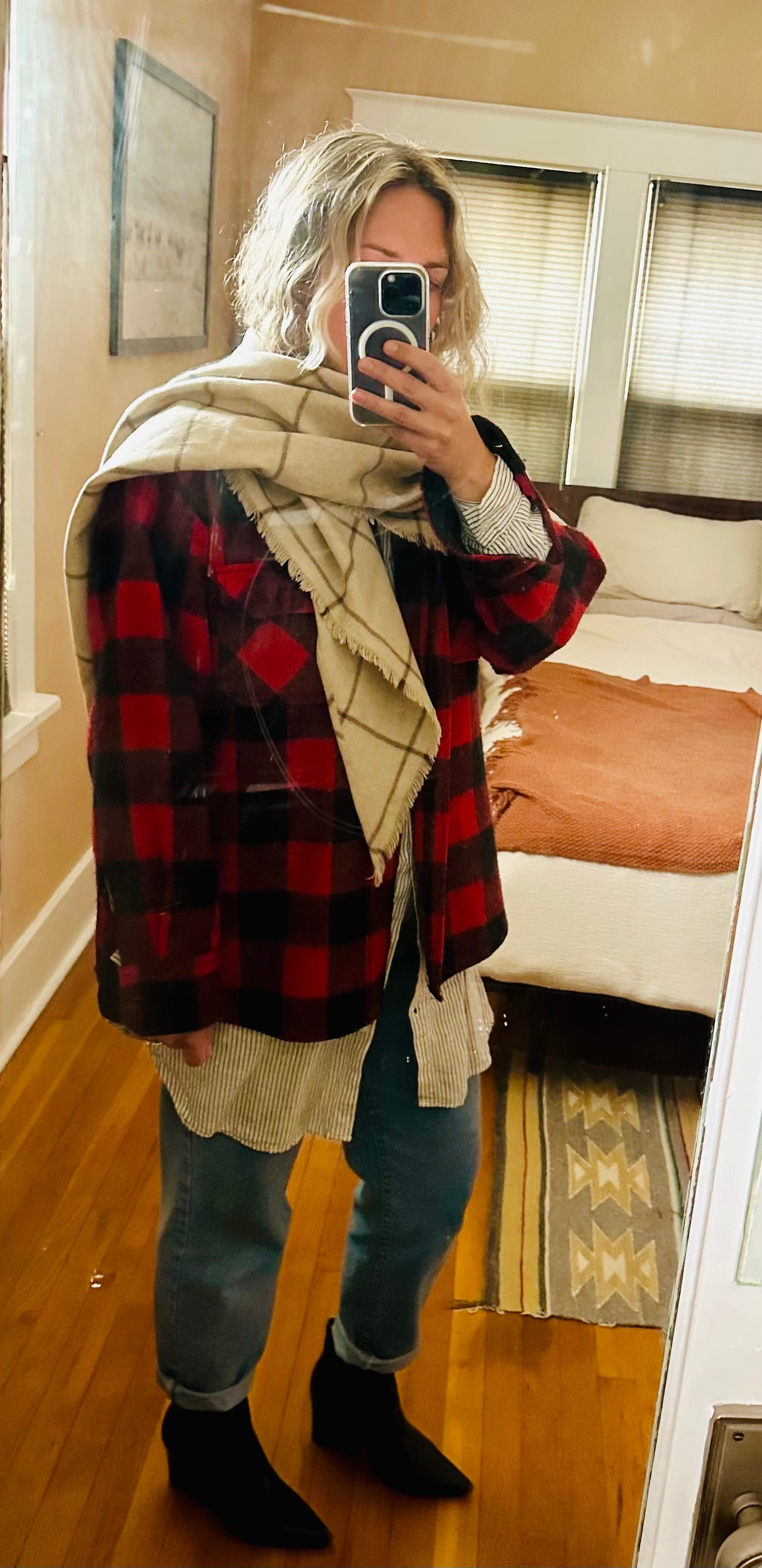 And here’s my own take on Long-over-Long, with vintage Lee jeans (on Etsy), a linen striped dress from Muji (similar here), my husband’s buffalo check flannel (inspired by Bottega, try this), my grandma’s triangle scarf (love this one), and pointy black boots (try these).