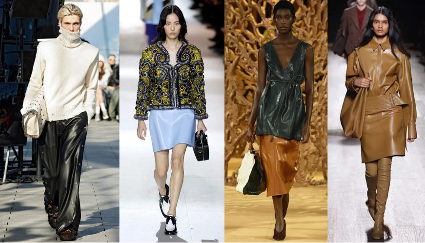 Whew! On to the next trend! I saw so much gorgeous leather on the FW 2024 runways, and it was a very specific type of leather. Light, smooth, soft, and in a range of interesting tones. It is the perfect thing to carry us through this transitional season and to bring back for fall, as it gives just the right amount of warmth and keeps out the wind, which has been absolutely terrible here in New Mexico lately! Here are my favorite leather looks from the runways: