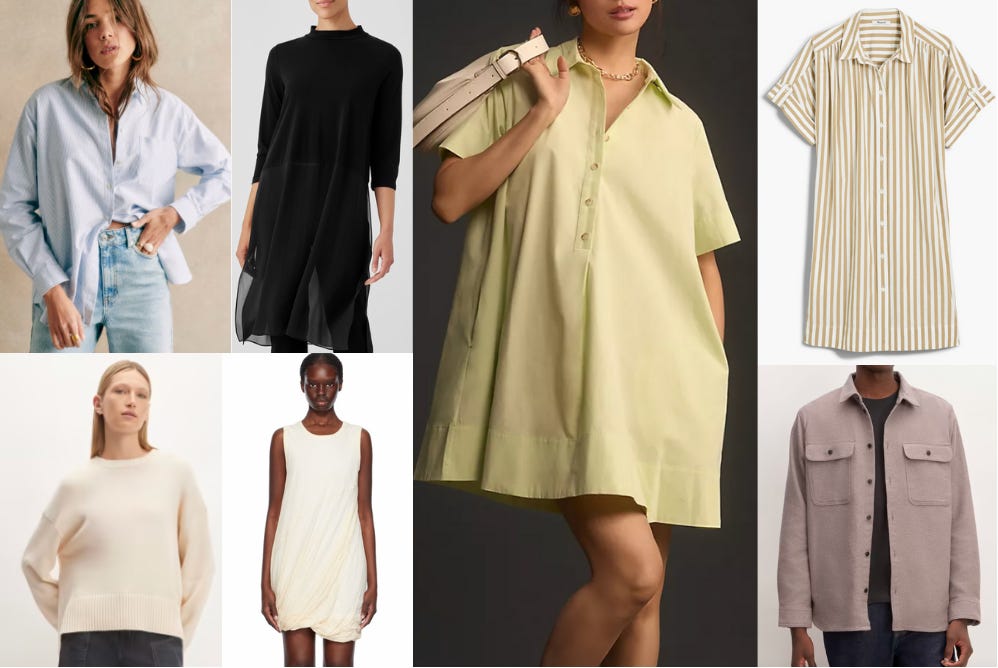 Clockwise from top left: Sezane Max top, Eileen Fisher sheer tunic, Anthropologie dress, Madewell dress, men’s Everlane flannel shirt (buy big!), Helmut Lang dress (buy oversized and wear over silkier long pants), Everlane sweater (go up a size or two)
